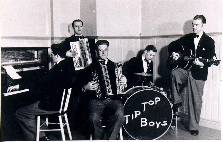 Dansband. Tip Top Boys. Bildades 16 okt 1937. Vid pianot Anders Heribertz, dragspelare Gunnar Augustsson och Hans Karlsson, trummor Gustaf Andersson, gitarr Curt Augustsson.