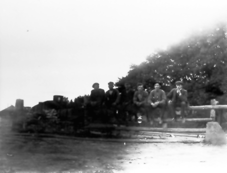 Titel: "Lunsastången" vid järnvägsövergången i Floby. Artur Nyblom, Erik Gegerfelt, Karl Wahlström. Sven Wahlström, Isidor Gegerfelt och Edvin Svantesson. Perrongen ännu ej utbyggd till landsvägen.