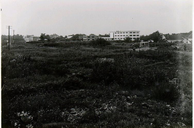 Kv. Ägir. Eriksgatan 4, Wahls AB tomt. Utsikt från Kvarnbackarna över Stenbrottet till tomten för AB Bröderna Wahls likkistfabrik i september 1939.