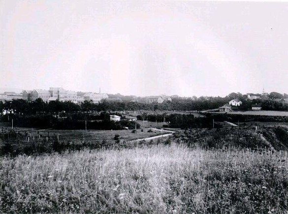 Planteringsförbundets park. Utsikt från höjderna i parken. Från vänster: Läroverket, Lasarettet,Gamla folkskolan i lasarettsparken, Gamla slöjdskolan vid nuvarande Frejagatan under byggnad, Jungmarkerska fastigheten, Forsska huset och kyrkan. I det mörka partiet mitt på bilden flöt Falebäcken. I bakgrunden: Länslasarettet till vänster och kyrkan till höger.