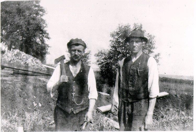 Rogestorps gård omkring 1920-25. Linus Wallin till vänster och Bertil Andersson till höger arbetade hos Rogestorps gård. Bertil Andersson var trädgårdsmästare och Linus Wallin gjorde "litet av varje". Bland annat byggde de tillsammans ett växthus.