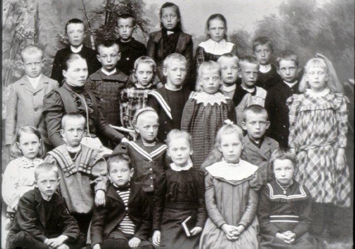 Skolfoto: Övre raden: Gustav Jakobsson, August Johansson, Ebba Lidén, Ingrid Andersson. Andra raden: Karl Magnus Forss, Sven Nilsson, Ebba Sandström, Allan Bergström, Ester Andersson, Folke Carlstrand, Evald Olsson, Erik Gustavsson, Ture Stark, Magda Norén. Nedre raden: Helny Larsson, Doris Pettersson, Lennberg (ev. är detta Ruth Lenberg) , Fritjof Angelund, Helge Tunberg, Allan Persson, Ingeborg Hedström, Nanny Lejon, Maria Persson. Lärarinna: Emma Larsson.