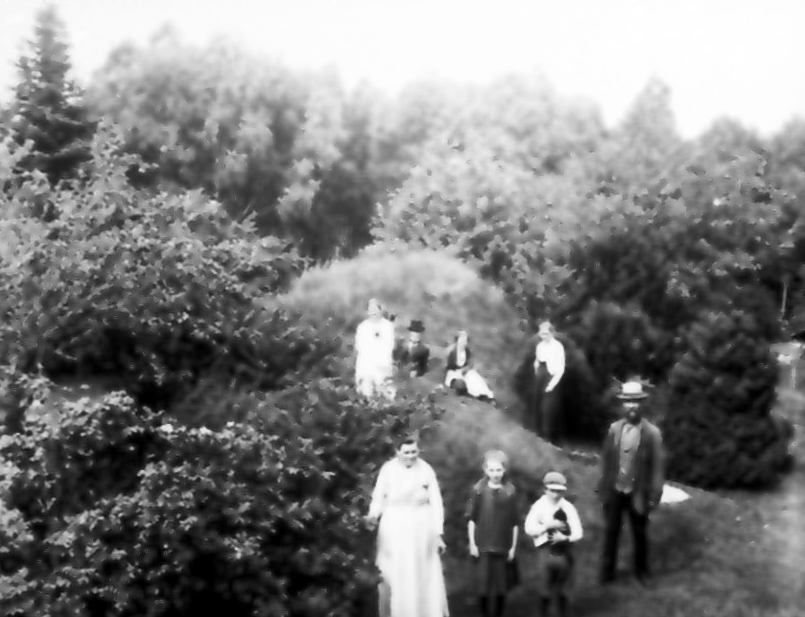 Alphems arboretum. Fotot taget på källarbacken nv om bostadshuset. Amanda och Frans Johan Gegerfeldt och barnen Astrid och Kalle. I bakgrunden fotografen Torsten Fält och systrarna Samuelsson från Trädgården, Floby.
