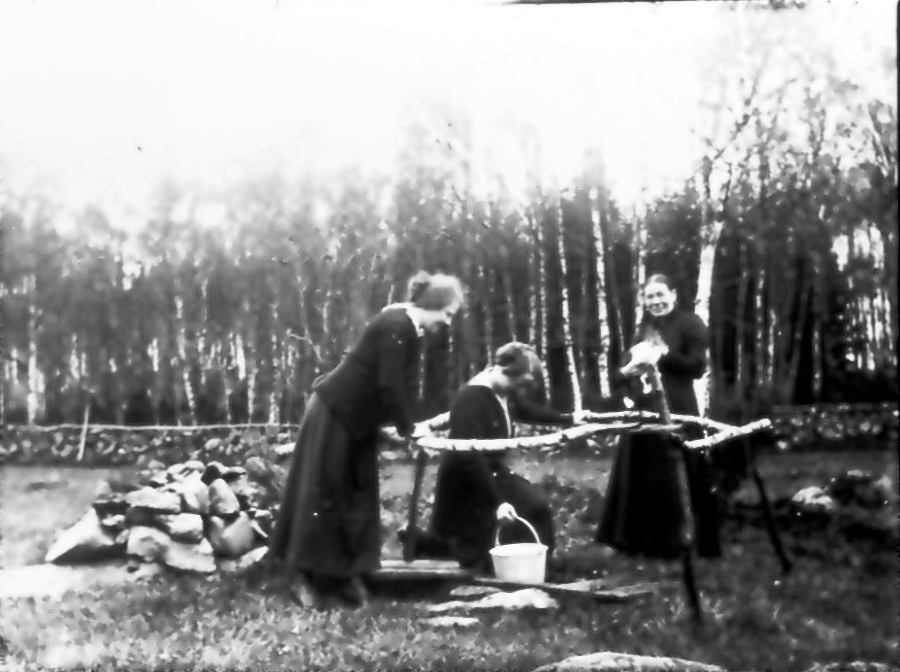 Lunnatorp eller "Lunnen". Vid brunnen Alva Jonsson, Hildur Jansson och Klara på Lunnen.