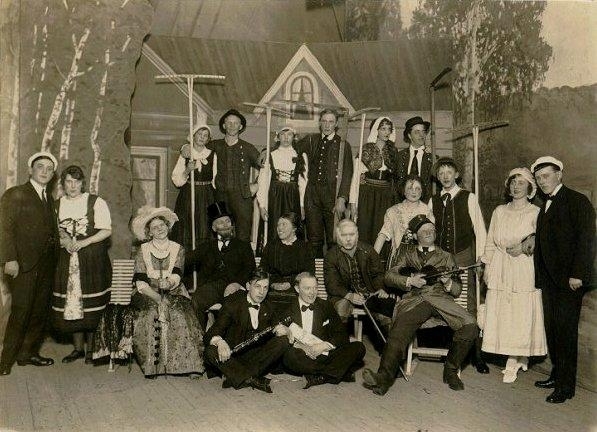 Enigheten. Deltagare i folkspelet "Närkingarne" på Enighetens teater. Från vänster stående, övre raden: Malla Karlsson (syster till Alida), Fahlström, född Lindström (syster till kortets givarinna), Fahlström, fröken Svensson, Rudolf Olsson, (son till C.Joh. Olsson). Stående andra raden: Konrad Gustafsson, fröken Lisa Lantz, fr Rut Persson, Knut Pettersson och Dagny Persson (de båda sistnämnda gifta med varandra), övermontör A. E. Persson, (bror till Arvid Persson) nedan. Sittande: fru Stina Jacobsson, född Fahlström, (maka till följ. Mårten Jacobsson), fru Villy Gustafsson, född Berggren, elektriker Arvid Persson (bror med A. E. Persson ovan), John Sahlgren. På huk: Arvid Pompeijus och Vilgot Thunberg.
