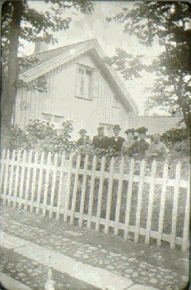 Kv. Hjorten, S:t Olofsgatan 58 - Botvidsgatan 70, 1898. Unikt. Här byggdes senare fröknarna Jonssons fastighet, vid anordnande av Botvidsgatans mynning. Gåva av Stationkarl V. Fagergren, Falköping. Omkring 1898. Från vänster: 1. Alb. Nylén, Maskinist 2. K.J. Fagergren, Fastighetsägare 3. Hillberg, hos Nordins 4. Fröken Pettersson 5. Hulda Fagergren 6. Fru Anna-Lisa Fagergren