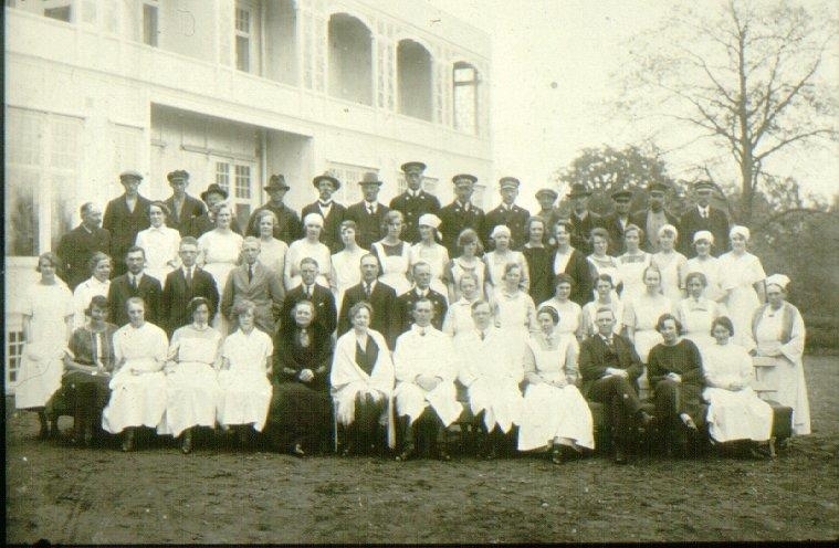 Gruppfoto Mössebergs Sanatorium.Översta raden: 1. Maskinisten Andersson, 2. Wik, 3. E. Karlsson, 4. Mandus Andersson. 5. Birger Thorin, 6. ?, 7. Högberg, 8. Nyblom, 9. Karl Gustavsson, 10. ? 11. ? 12. ? 13. Nilsson, 14. polis Fahlgren. Andra raden uppifrån: 1. Elna Larsson, 2. Vera Skatt, 3. Kajsa Bergsten, 4. Anna Eriksson, 5. Karin Johansson, 6. Linnea Ljus, 7. Maja Tidell, 8. ? 9. Ellen Karlsson, 10. Agnes Karlsson, 11. Agnes Lindkvist, 12. Vera Karlsson, 13. Karin Palmén, 14. Svea, 15. Marta Malmström, 16. ? 17. Signe Dahlén, 18. Agnes Johansson. Tredje raden: 1. ?, 2. Anna Andersson, 3. Karl Persson, 4. Herbert Palman, 5. Sjöblom, 6. Alf Johansson, 7. Arvid Andersson, 8. Åstrand, 9. Märta Karlsson, 10. Stina, 11. ? 12. ? 13. ?. Fjärde raden uppifrån:1. Tidholm, 2. Karin Olsson, f. Lindgren, 3. ? 4. Fru Hahne, 5. Fru Odner, 6. Dr Frumeri, 7. Dr Garby, 8. syster, 9. kamrer Andersson, 10. Sivert, 11. Ella Strömbäck, 12. ?.