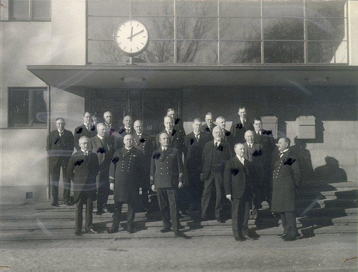 Guidning av nya stationshuset. Falköpings central. Övre raden från vänster: 1. skomakarmästare Carl Rydell, 2. maskiningenjör Von Bar, 3. portvakt Gustav Roos, 4. postmästare Enock Svedberg, 5. brandchef Bengt Raab, 6. stins Fant,7. doktor Uno Lindgren, 8. redaktör Karl Lantz, 9. prosten Fritz Wetterholm, 10. telekommissarie Birger Åkerman, 11. apotekare S.G. Wickelgren, 12. doktor N.A. Ahlberg, 13. fastågast. Karl Johansson, 14. ingenjör direktör Erik Hagman, 15. direktör G.W. Nymberg, 16. direktör Primus Forss, 17. trafikinspektör C.M. Paulsen, 18. distriktschef Gösta Dahlberg, 19. rektor Harald Wagner, 20. direktör Josef Haglund, 21. baningenjör Jarl Stanzén.