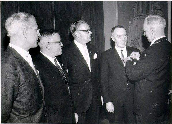 Veterantecken utdelas av ordförande Konditoum. Göte Henriksson till chark. Harry Vallin, skorstensfejaren Gunnar Olsson, frisör Harry Nordgren.