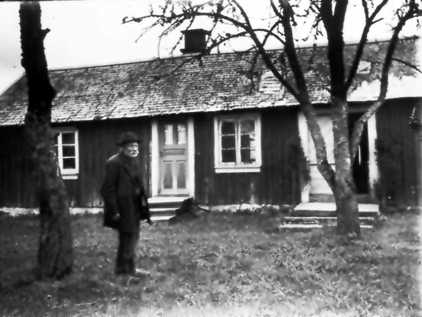 Johan Andersson "Rök-Olle" feller "Olsa-Johan" ramför sin stuga norr om gården Hjärporna. Han och hustrun Johanna rökte korv och fläsk åt folk. Kallades också "Slev-Olle" då han täljde skedar.