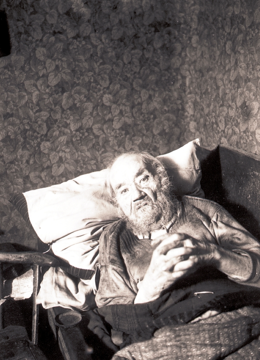 Anders Johansson född 16/11 1824 i Kinneved. Här fotograferad, över 100 år gammal, i mars 1925 på Vättesön i Källunga socken, väster om Ramla mosse.