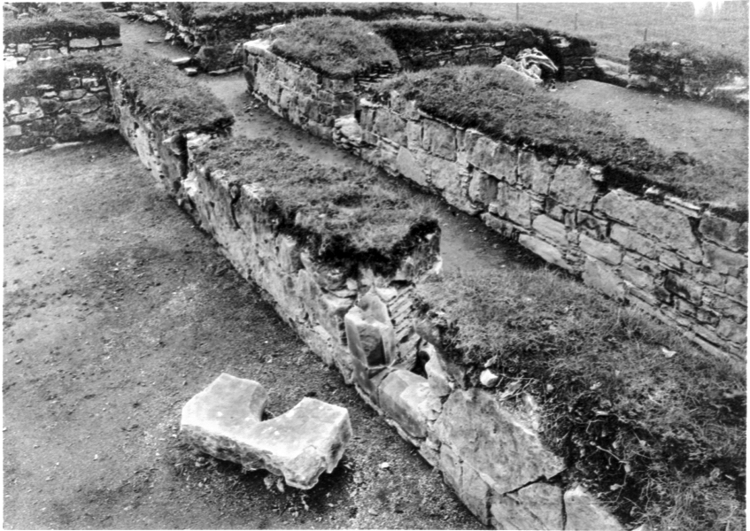 Klostergårdens nordmur och n. Korsgången från sydost I förgrunden bågsten nr 575 tillhörande n. Korsgångens östligaste fönster i läge som den påträffades.