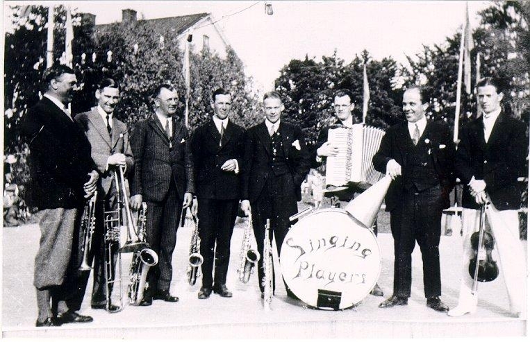 Dansband. Singing Players på spelning i Hjo, omkring 1930. Kapellmästaren och tillika landsfiskalen Gösta Olsson är mannen med megafonen.