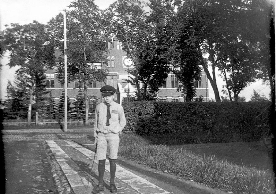 Rut Jonzons yngste bror Berndt. Folkskolan i bakgrunden.
