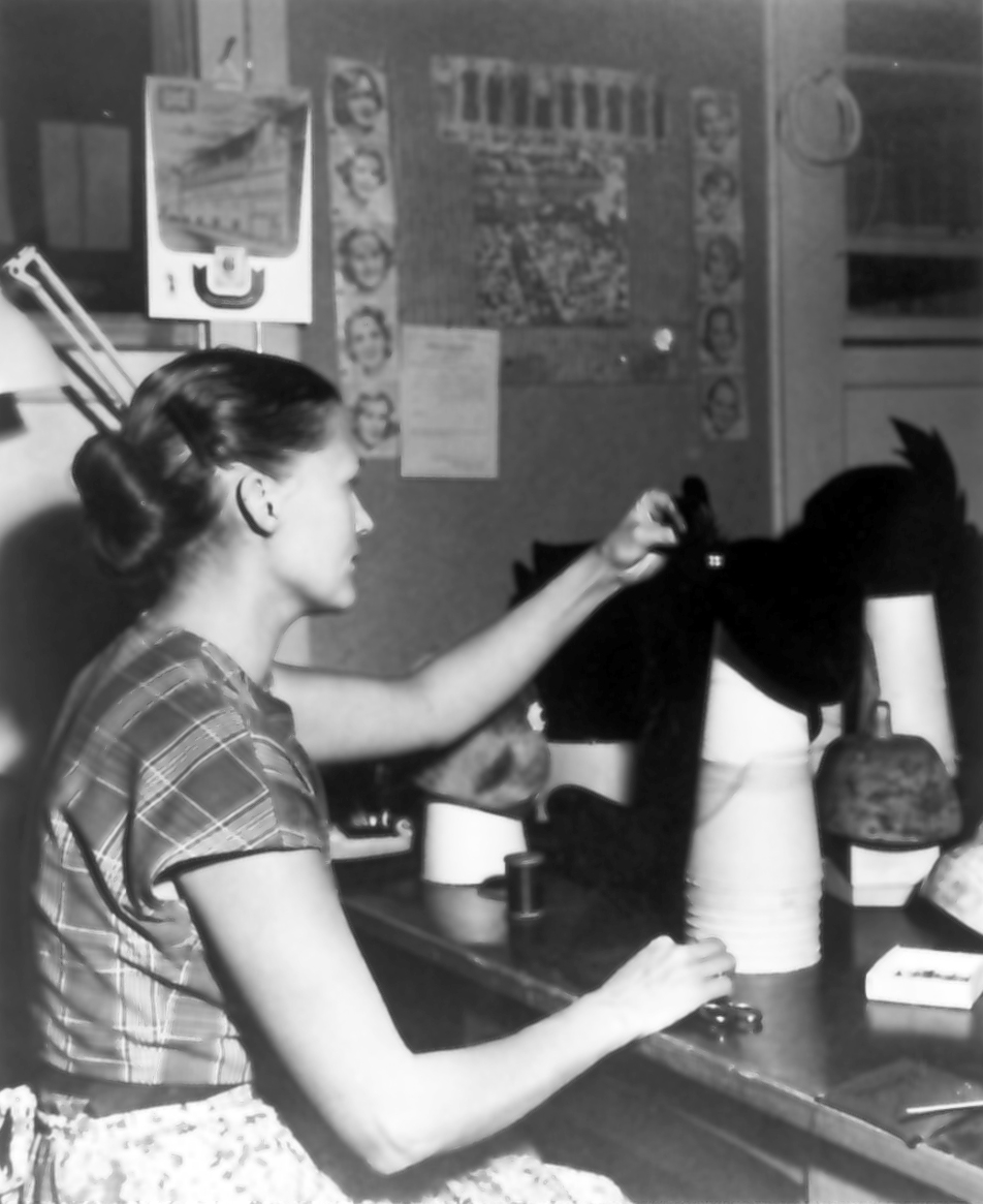 "Pricken över i-et sättes av fru Sigrid Ström" (Rantens hattfabrik). Från utställningen "Falköping i bild" 1952.