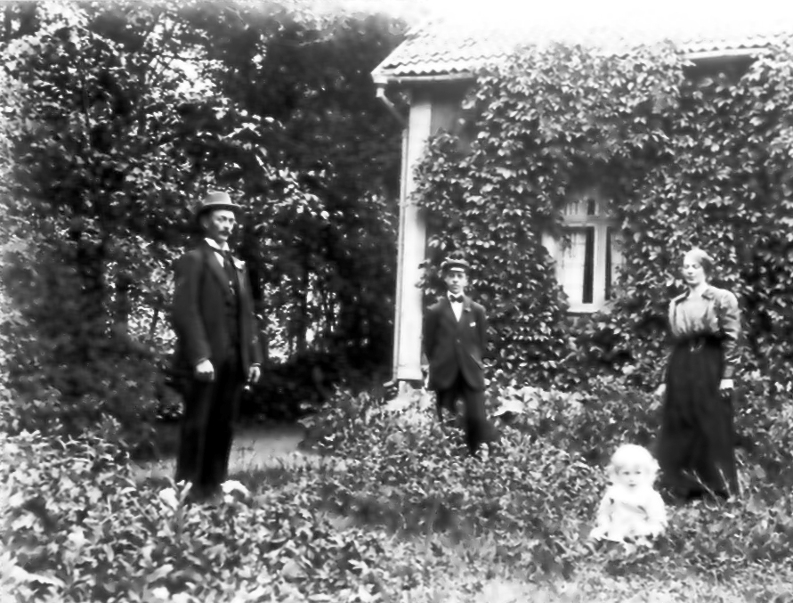 Österås. Emil, Ejnar och Nenny Gustavsson och hennes son Gösta född 1918. Baksidan av huset.