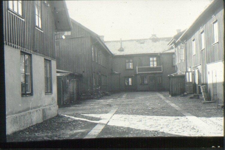 Storgatan 8, åt gården. Gårdshuset t.v. det första av tegel uppförda huset i Falköping, byggdes år 1842.