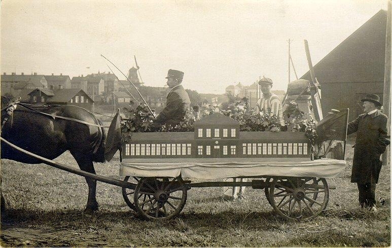 Karnevalståg. En situationsbild från ett karnevalståg, förmodligen från början av 1910-talet med Rantens stationshus på flaket. Inskriptionen är Falköping - Ranten. Observera krutflaggan. I vagnen: Lokeldare Nils Ström. Till höger lokmästare S.R.E. Alexandersson, Ranten. Närmast till vänster Nordins smedja, där "Ballerstenen" hade sin plats, innan den flyttades till Stadsparken. I fonden Väderkvarnen innan den miste sina vingar och sedermera drevs med elektrisk kraft. Till höger om kvarnen Samskolan.