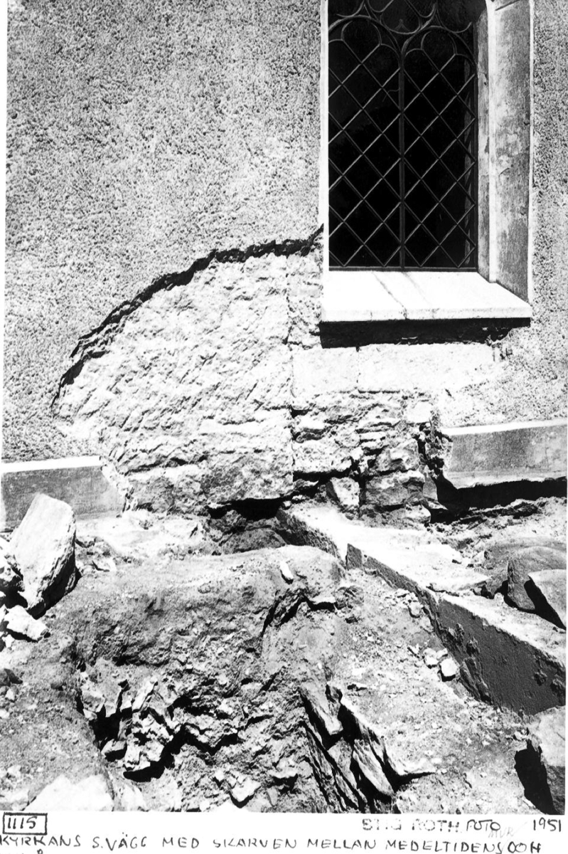 Kyrkans vägg med skarven mellan medeltidens mur och 1811 års kor. T.h. Kafleska gravkorets västra mur. Både till Kafleska gravkoret på 1600-talet och ombyggnaden av kyrkans kor 1811 användes huggen sten ur klosterruinen.