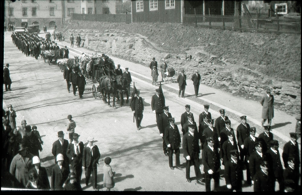 Frans Setterberg, stationsförman, förolyckades 1927. Begravningståget leddes av musikkåren, därefter kom en förtrupp, prestave, likvagnen, de sörjande. Allt järnvägsfolk deltog denna söndag.