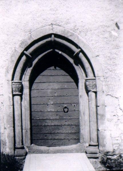 S:t Olofs kyrka. Undersökningen 1950-62. Bild 1A: Södra dörren i långhuset med "kulhål" från kriget med danskarna.