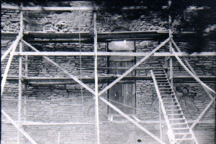 S:t Olofs kyrka. Undersökningen 1950-62. Bild 3C: Södra kyrkväggen delvis befriad från puts. Bild 4D: Södra kyrkväggen (Den östra delen) befriad från puts.