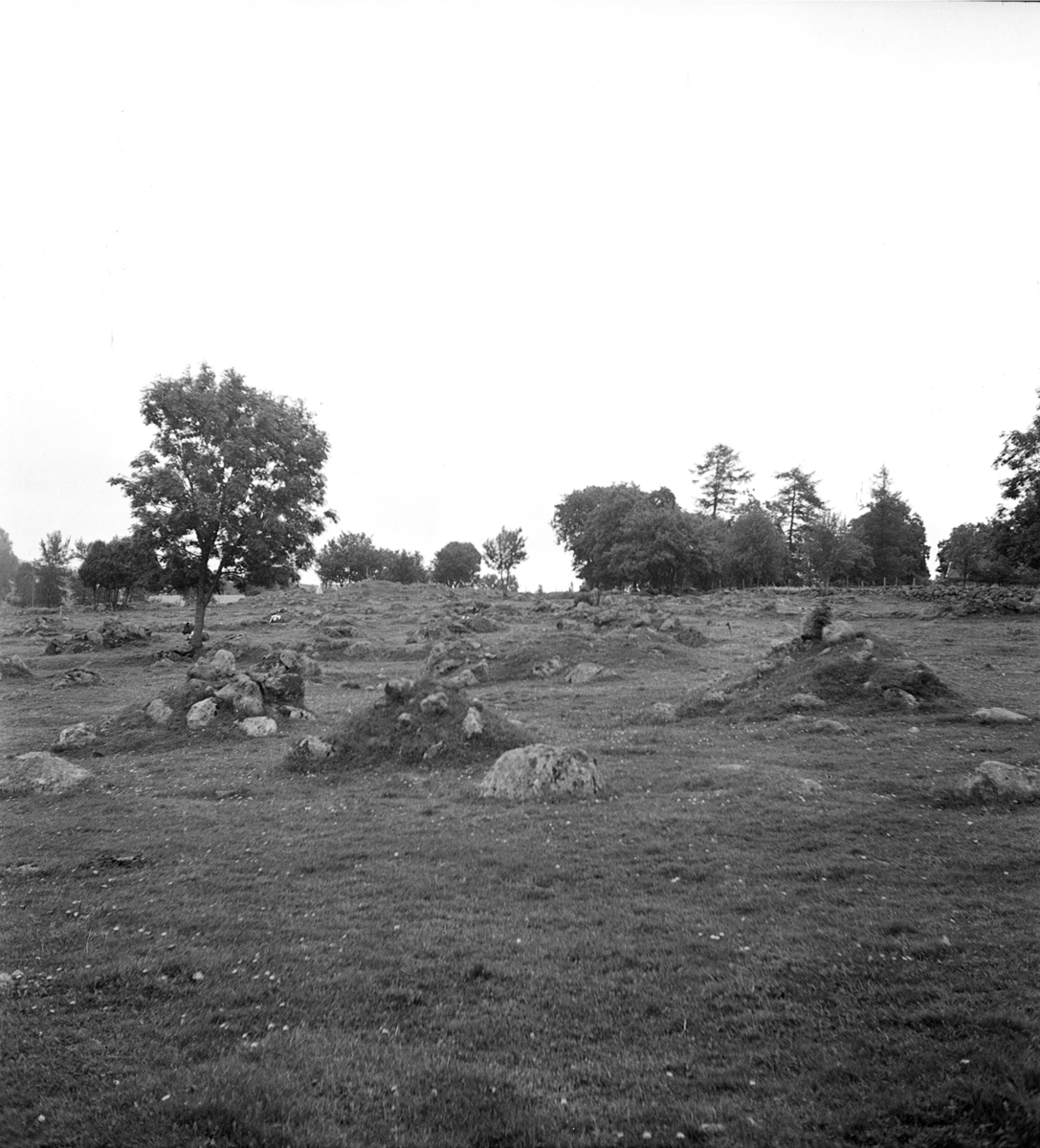 Fyrkantsröse på ängsmark på en hög ås, ca 300 m oso om gården. Bilden tagen från en skålgropssten strax sv därom. Nr 32 i H Svenssons inventering, 1951.