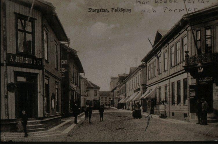 Storgatan hörnet Storgatan 18, J. Janzon Speceri och Viktualiehandel, i 4.e fönstret på andra våningen räknat från Ekmans gränd bodde E.G. och Johanna Bohman, Greta Wennbergs farfar och farmor. Johanna f. Haglund. Affären på nedre botten damskräddderi.