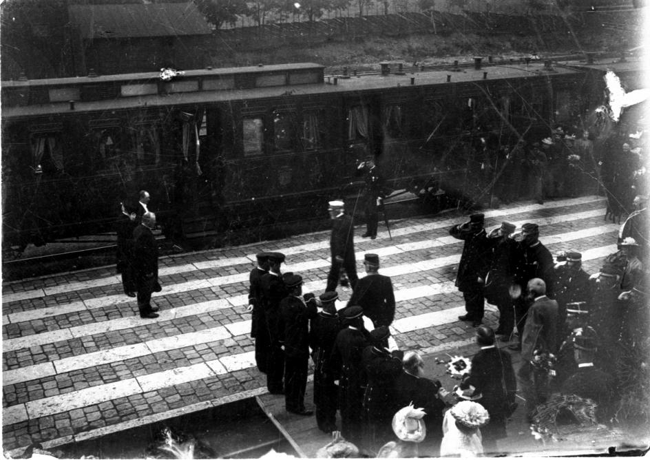 Kungen på väg till järnvägsvagnen från matsalen Rantens hotell.