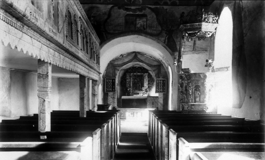 Interiör Göteve kyrka. Till vänster drängaläktaren.