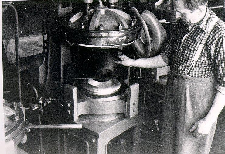 J.A. Forss Hattfabrik. Formpress - formpressning av kullen sker genom att man placerar hatten i en aluminiumform. Utsidan pressas med hjälp av het ånga, insidan av kullen pressas genom att man för in en gummiblåsa med vatten.