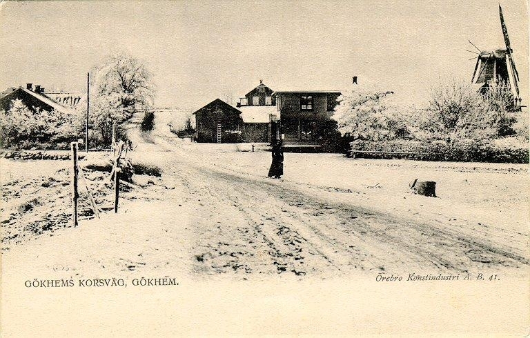 Gökhems Korsväg. Lanthandel och väderkvarn i Gökhem. Väderkvarnen var kvar till omkring 1915.
