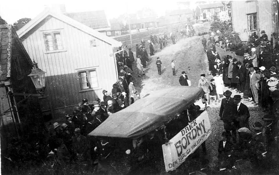 Karneval omkring 1925. Storgatan, karnevalståg från Hästbacken. Till höger spannmålshandlare Gustavssons. Till vänster repslagare Johanssons på Hästbacken 4.
