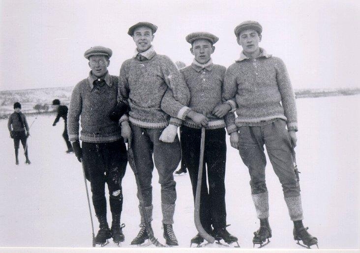 Idrott. Från höger: Erik Nyberg, Holger Johansson, Conrad Sundbeck, Sven "Snurren" Mörk. Endast Sundbeck har bandyrör, övriga har vanliga skridskor.