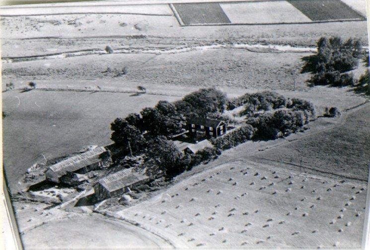 Abrahamsgården. Flygfoto över gården. Körhuset fanns då kvar vid östra loglängans norra gavel.