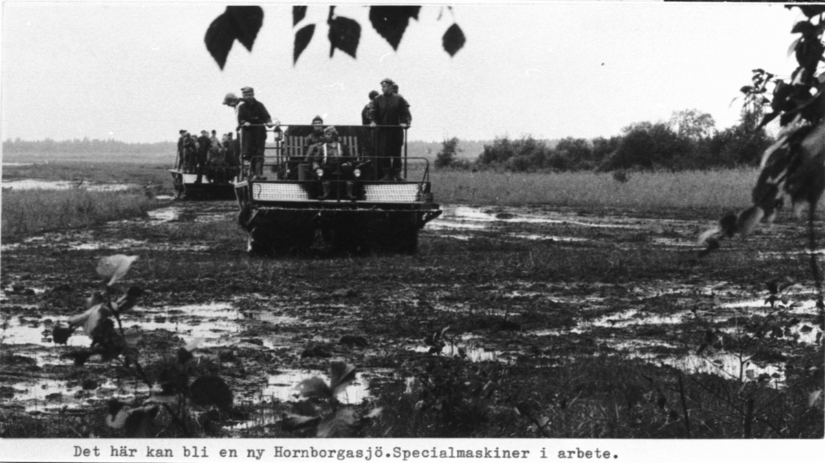 Specialmaskiner i arbete vid Hornborgasjöns utkant.