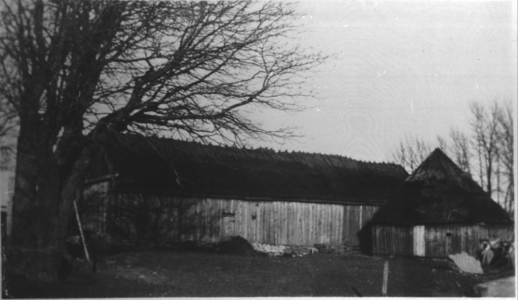 Måns Jönsgården. Ladugårdsbyggnader. Södra längan av ladugårdarna i Måns Jönsgården, Stenstorp. Antagligen byggda efter enskiftet 1827. Revs på grund av vägbyggnad.