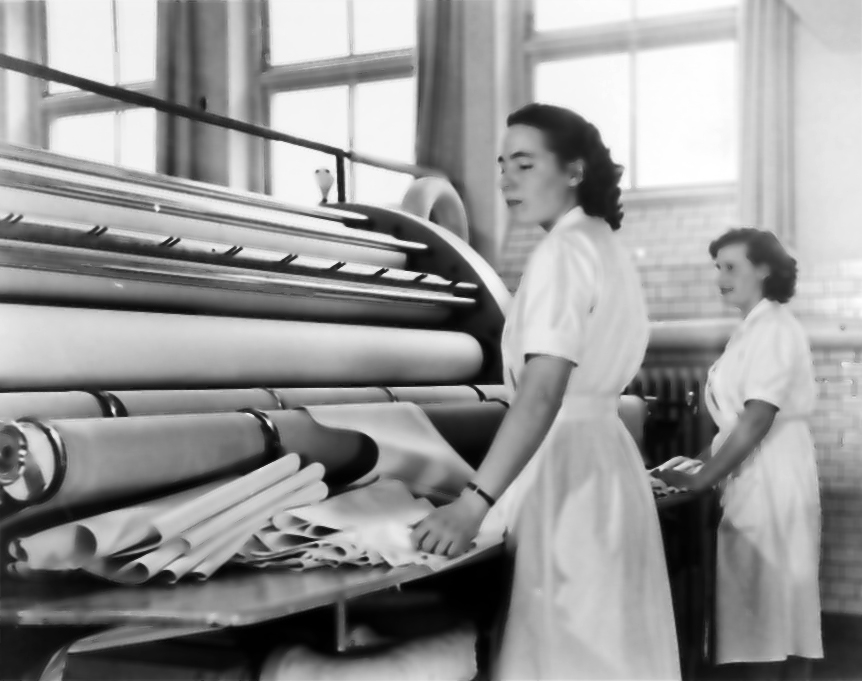 "Tvätten manglas" (Lasarettet). Från utställningen "Falköping i bild" 1952.