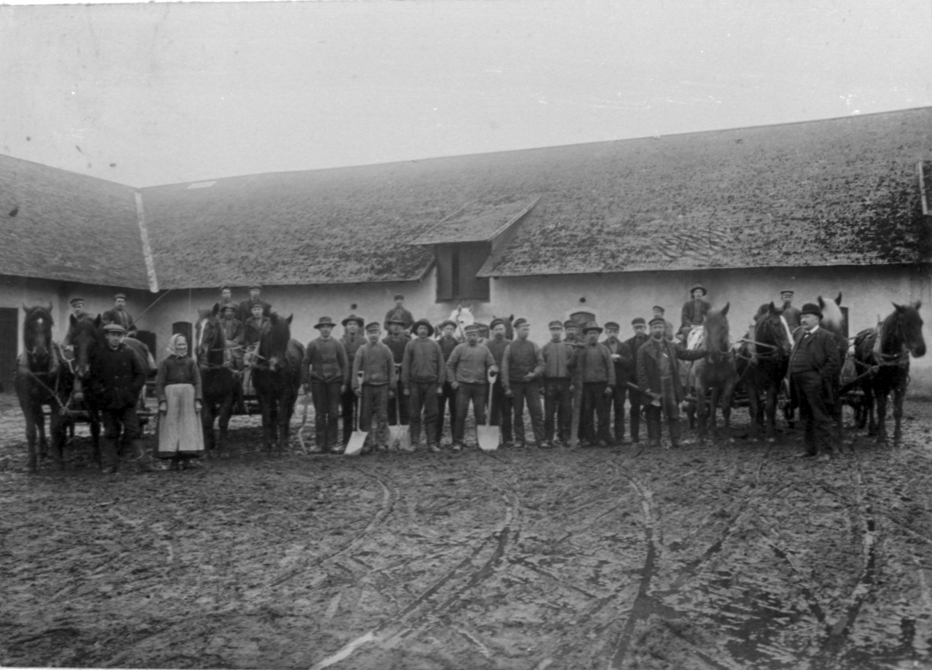 Bäckabo kalkbruk under Edvard Bergströms tid. Edvard Bergström längst till höger, sonen Ernst ? längst till vänster vid hästarna. Kvinnan kallades "Lova". Mannen med spaden (framför vita hästhuvudet) var kalkarbetare Ask, som bodde bortom Ranten (i "mossen"). För övrigt både jordbruksarbetare och kalkarbetare.