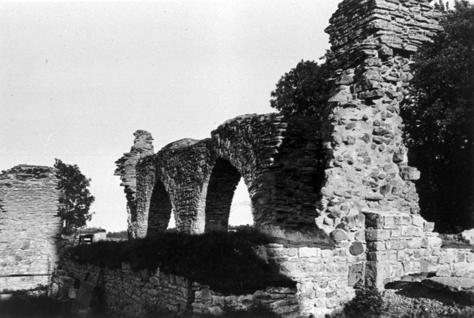 Klosterkyrkans ruiner med de uppstickande bågvalven i n. arkadräckan i långhuset.