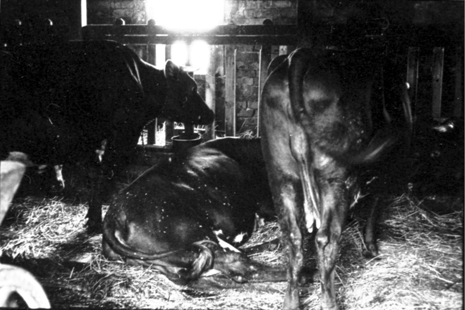 Titel: Bossgården. Fähuset med djurbestånd. De små fönstren ger skum belysning.