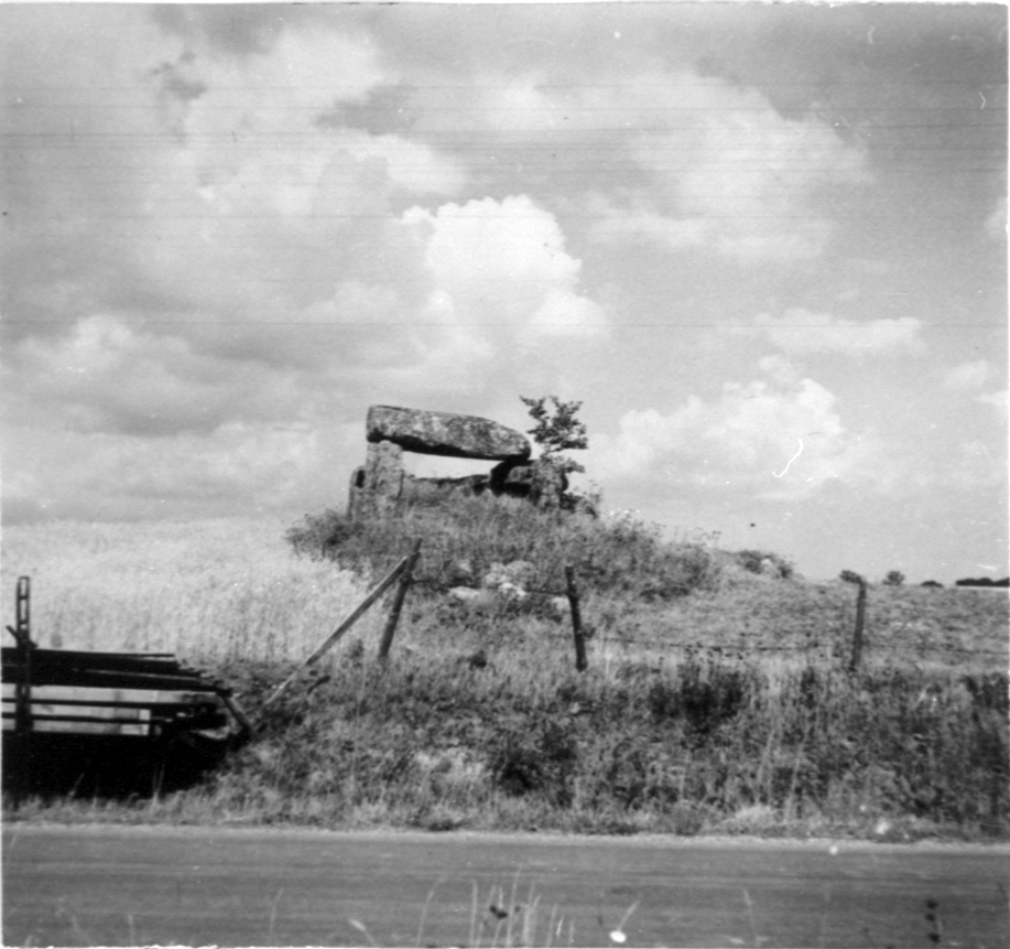 Knaggårdens gånggrifter. Landsvägen och uppstaplade snöskydd i förgrunden.