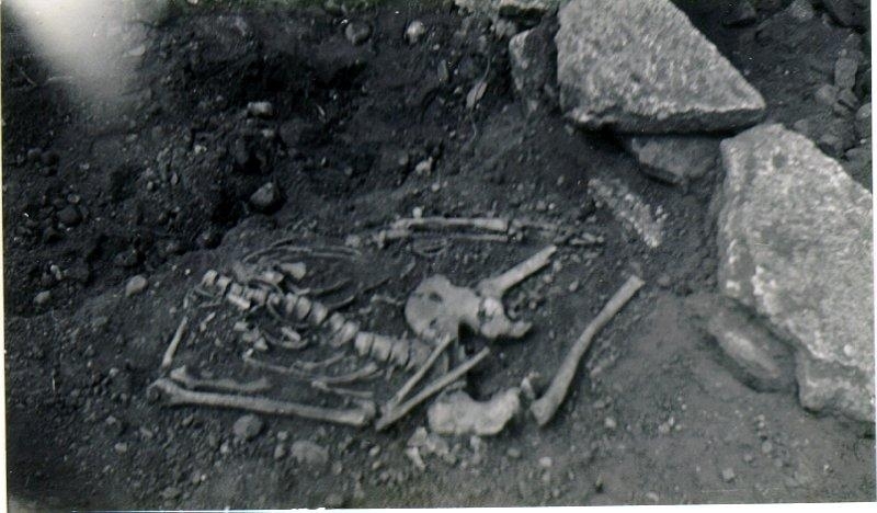 Skelett påträffat vid utgrävning av varggrop. Skelettet låg utanför muren till gropen. Kraniet saknas.