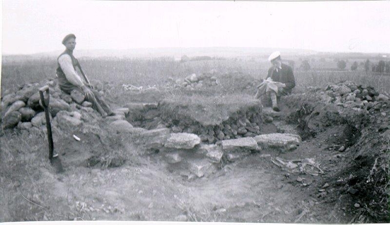 Utgrävning av varggrop med intilliggande skelettgrav juni 1934. Varggropen består av stensatt grop där väggarna kallmurats. Gropen har senare fyllts med odlingssten.