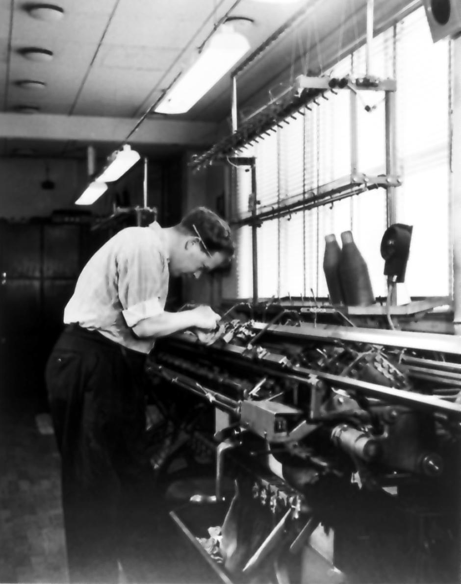 "Stickmaskinen justeras" (Ottossons textilfabrik). Från utställningen "Falköping i bild" 1952.