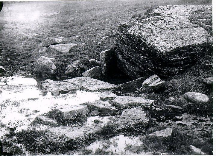 Titel: Offerkällan "Löve-käll" eller St. Livers källa. Redbergagården eller Hässlet. Stensatt, stort stenblock i ena änden.