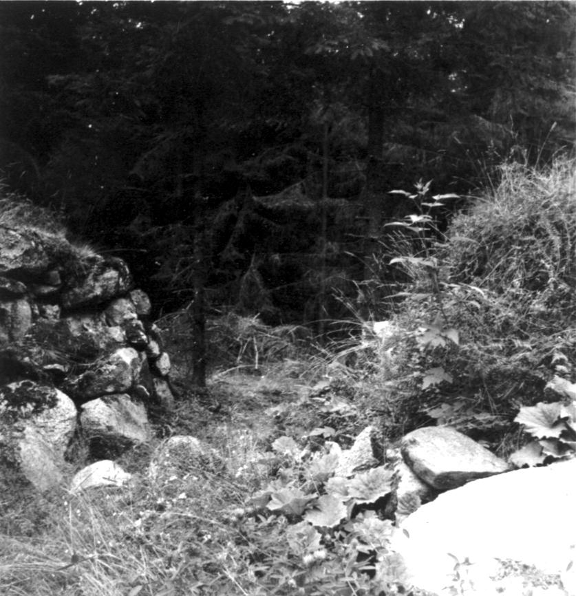 Ruin efter jordkula (backstuga). Foto inifrån mot utgången. Spiselhällen ligger till höger. "Gullstubbes" föräldrahem.