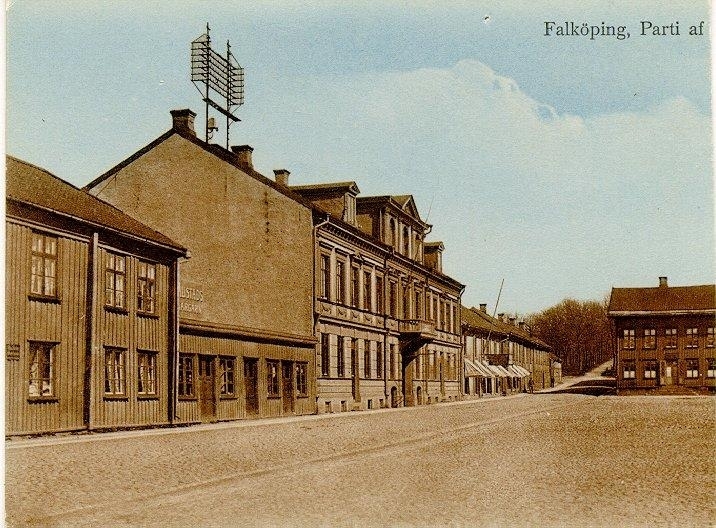 Del av torget med affärer. (färglagt foto)