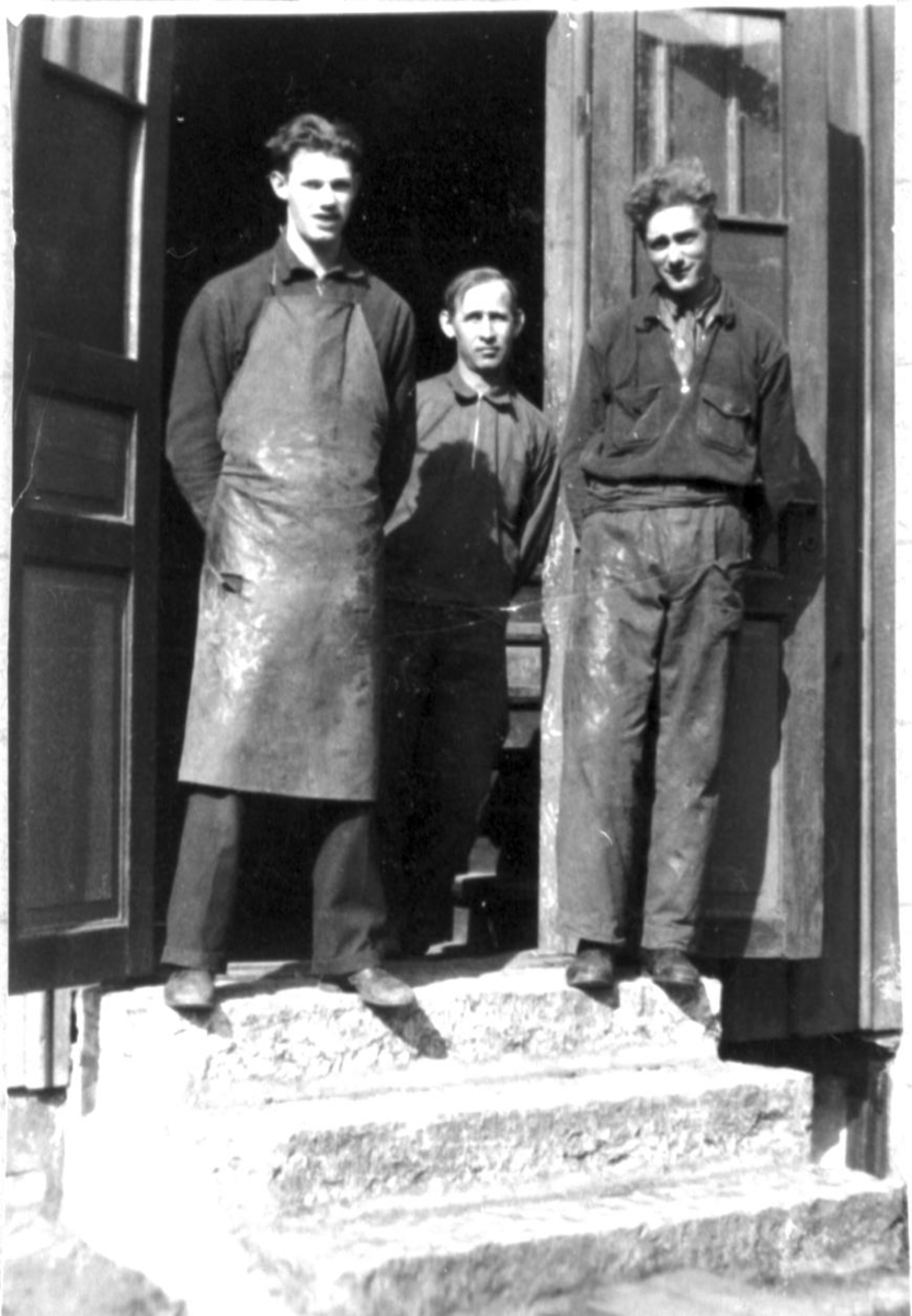 Charles Anderssons verkstad: på trappan från vänster Erik Johansson, Gustav Andersson och Lennart Gustafsson