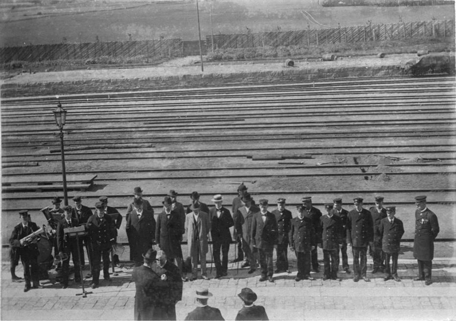 Falköping-Ranten. Bangården. Medaljutdelning på Rantens station 1880-90 talet. Stins Wållgren längst till höger.